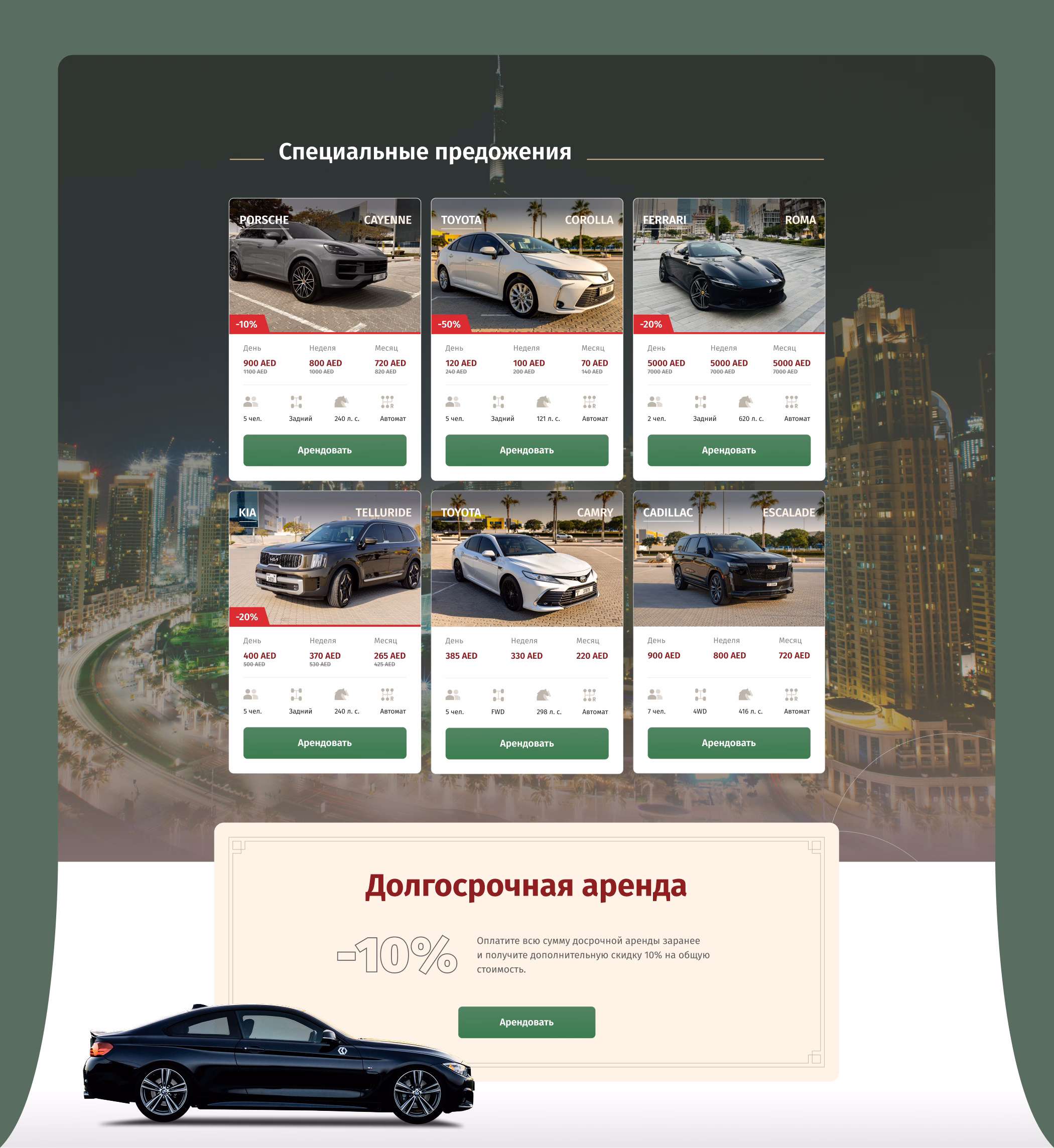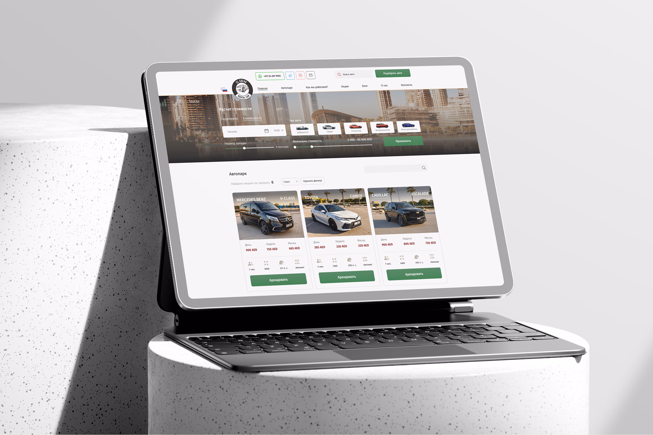 Светлый сайт с арабскими орнаментами, зелёно-бежевой палитрой, передающий атмосферу восточного гостеприимства. Минималистичный дизайн и логика страниц помогают быстро ориентироваться в выборе автомобиля и его характеристиках.