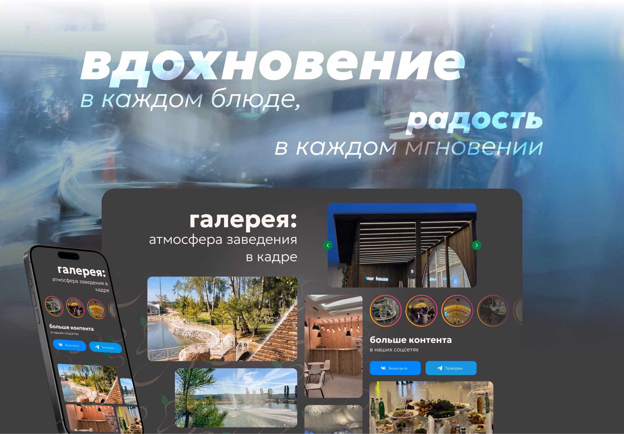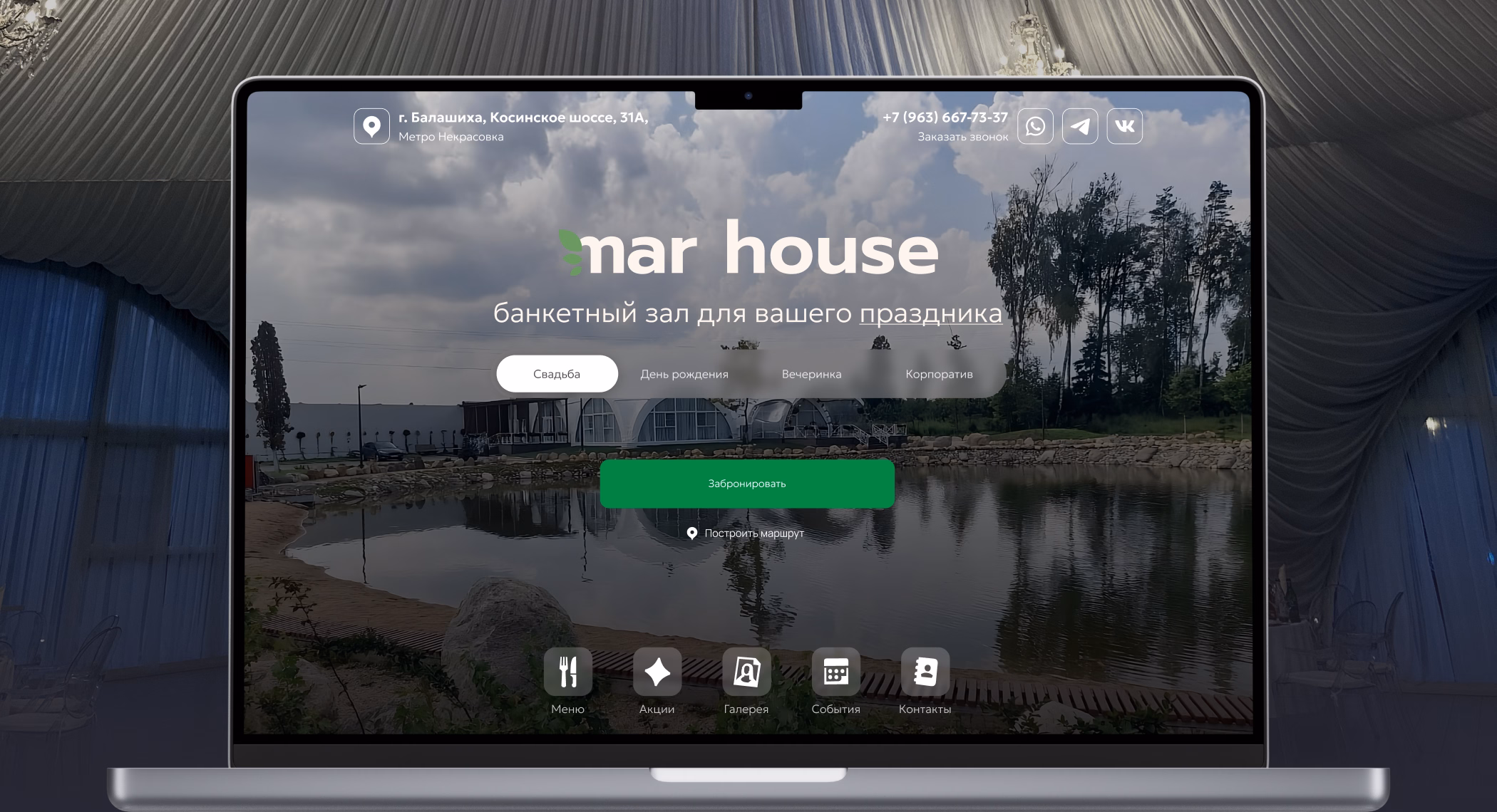 Сайт с удобным выбором типа мероприятия и бронированием, виртуальным туром по залу, галереей из соцсетей, которая показывает живую атмосферу заведения. Электронное приглашение позволит гостям получить всю информацию о событии в одной ссылке.